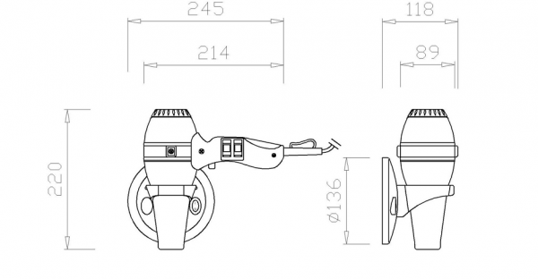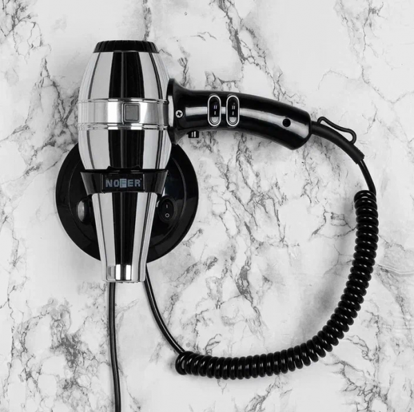 Профессиональный фен для волос пистолетного типа. Настенный кронштейн. Данный аппарат имеет 2 режима которые регулирует скорости потока воздуха и 2 режима регулировки температуры воздуха. . Корпус фена выполнен из ABS пластика и хромированной стали. Прекрасно подойдёт для гостиниц, отелей и салонов красоты