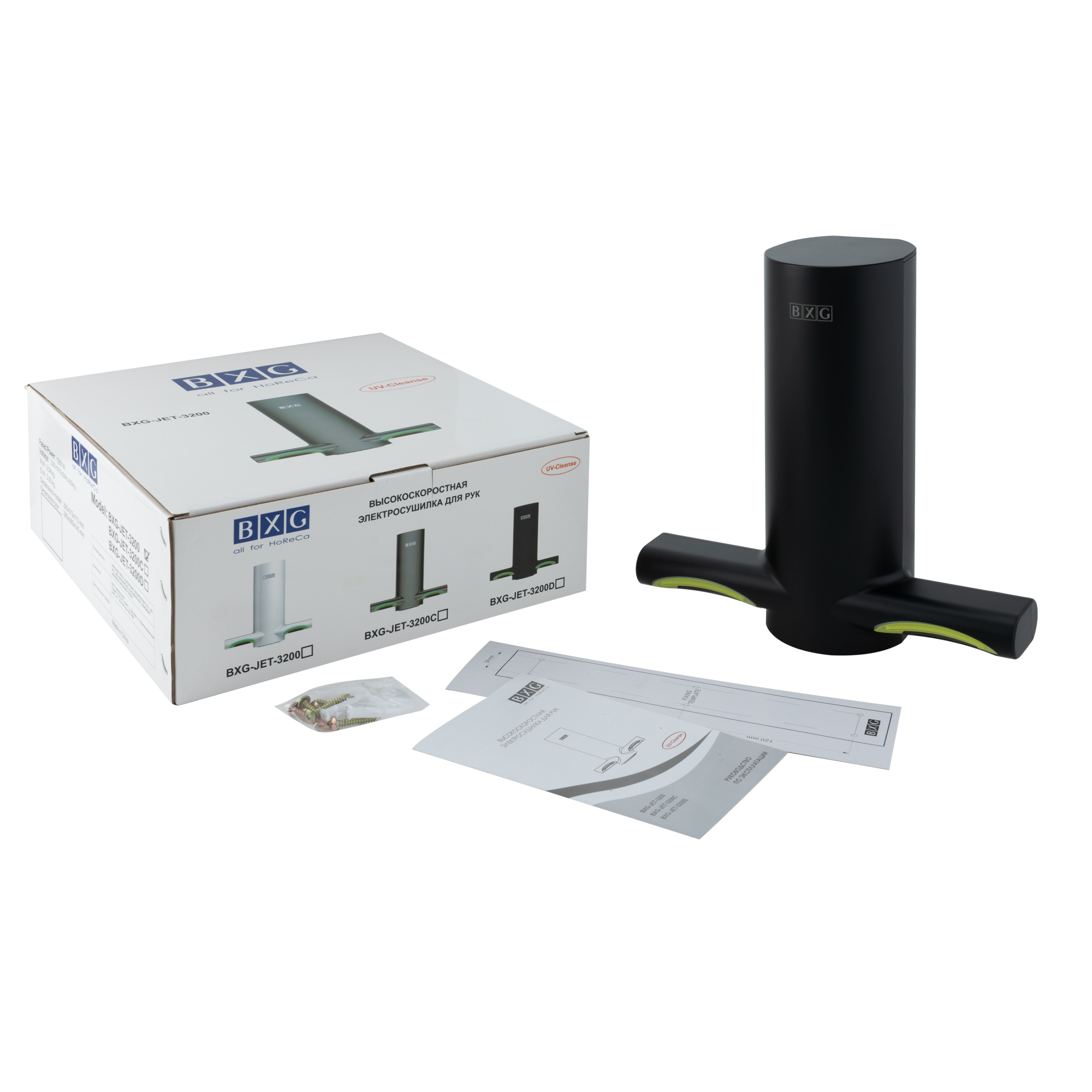 BXG-JET-3200D – Высокоскоростная электросушилка сушилка для рук нового поколения с функцией Ультрафиолетового обеззараживания. Сушилка выполнена из высокопрочного пластика ABS в благородном черном цвете с матовым оттенком.