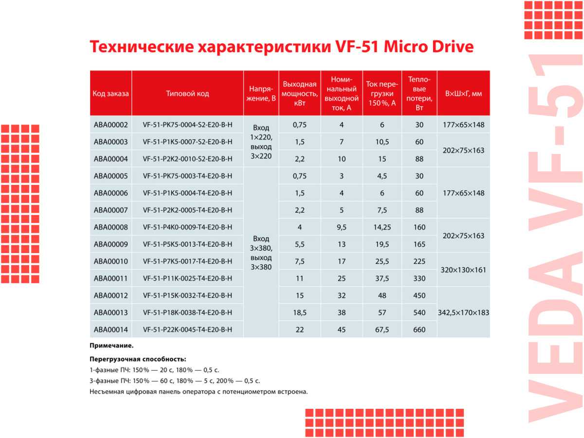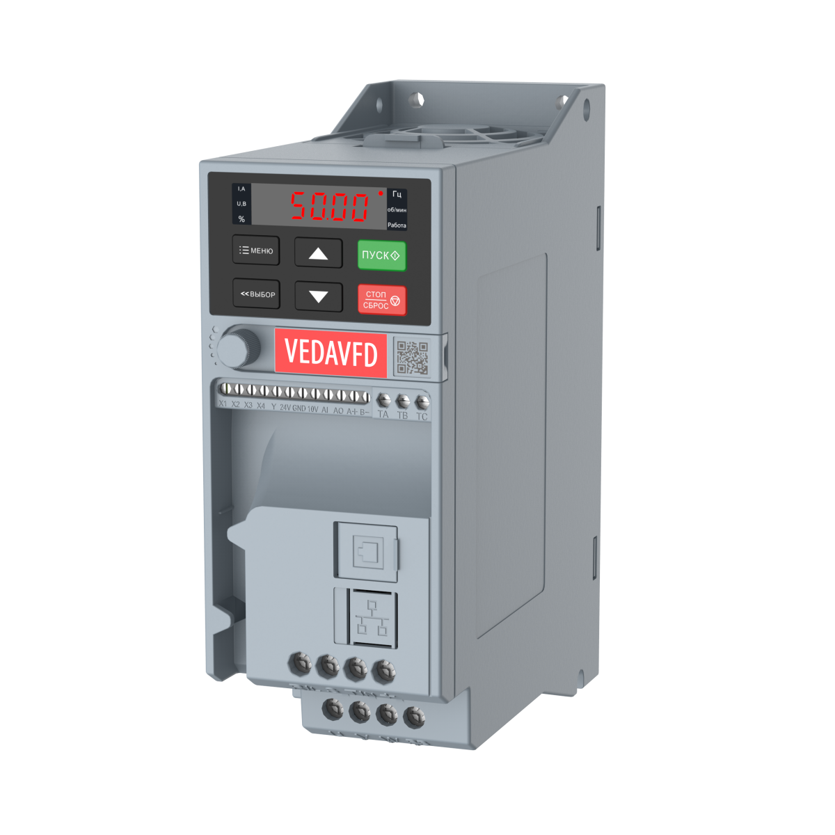 - VEDA cерии VF-51 имеет встроенную цифровую панель оператора с потенциометром на русском языке, что позволяет сэкономить на приобретении пульта и сокращает время на ввод в эксплуатацию.
