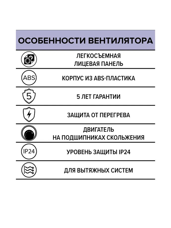 Легкосъемная лицевая панель. Благодаря специальной конструкции базы закрытая лицевая панель не мешает вытяжке воздуха из помещения. Эффективность работы вентилятора подтверждена лабораторными исследованиями. Монтажный шаблон помогает отметить место для крепления вентилятора. В вентиляторах с опцией C устанавливаются обратные клапаны новой конструкции. Уровень защиты – IP24.