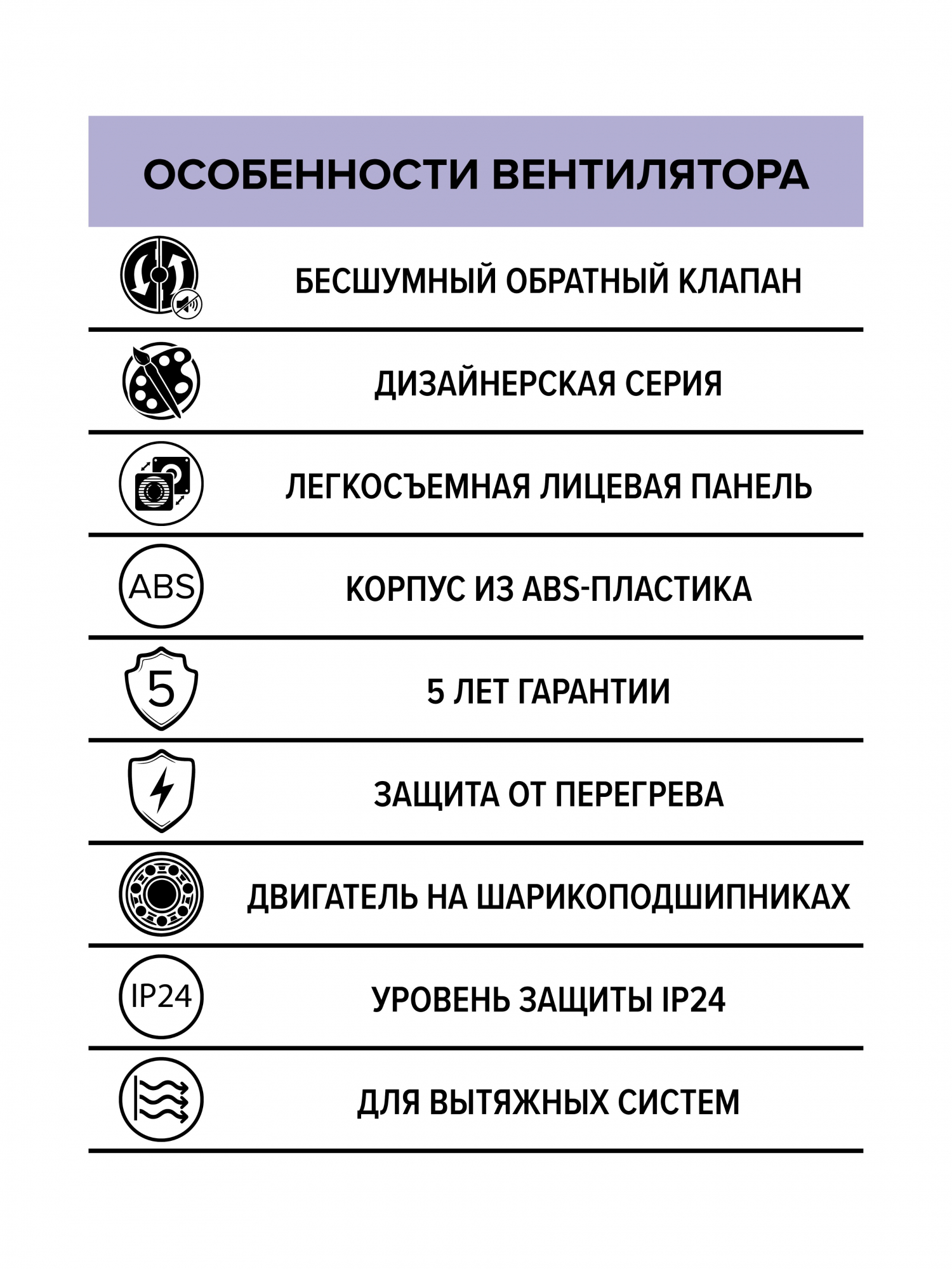 Вентилятор RIO применяется для постоянной или периодической вытяжной вентиляции санузлов, душевых, кухонь и других бытовых помещений. Подходит для монтажа в вентиляционные шахты и соединения с воздуховодами. Особенности вентилятора RIO: - гармоничный дизайн закрытой лицевой панели с плавными скругленными формами и центральным декоративным отверстием. Панель легко снимается, упрощая обслуживание вентилятора; - бесшумный обратный клапан с силиконовыми стопперами, - монтажный шаблон в комплекте для простой и удобной установки вентилятора, - широкий выбор цветовых решений и текстур: базовый белый (RIO 4C, RIO 4C-02, RIO 4C MRH), Ivory (RIO 4C Ivory), Matt white (RIO 4C Matt white), Obsidian (RIO 4C Obsidian), Dark Gray metal (RIO 4C Dark gray metal), Gray metal (RIO 4C Gray metal), Champagne (RIO 4C Champagne). Долговечный двигатель на шарикоподшипниках гарантирует до 40 000 часов непрерывной работы, предохранитель Termo fuse отключит вентилятор при нагреве обмотки свыше +130 °C. RIO можно установить как в стену, так и в потолок (при снятии обратного клапана), двигатель не требует дополнительного обслуживания. Корпус и панель выполнены из высококачественного и прочного ABS-пластика, который надежно прослужит весь срок использования и не пожелтеет. Монтаж осуществляется с помощью саморезов, которые входят в комплект. Уровень защиты – IP24. Гарантийный срок 5 лет.