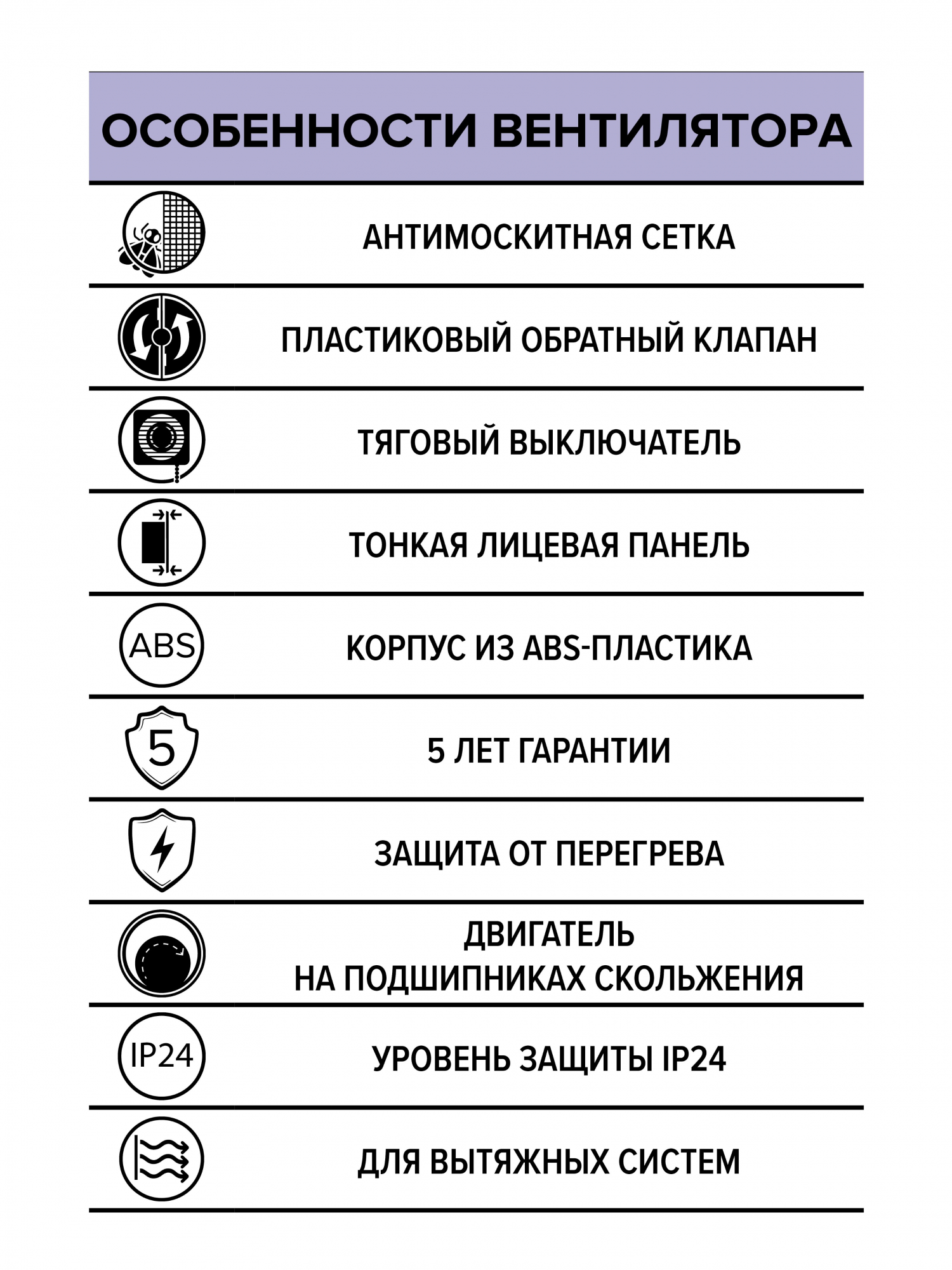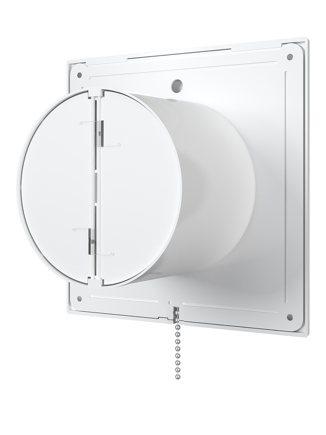 Модель оснащена обратным клапаном, который устанавливается на фланец и защищает помещение от обратной тяги и проникновения из вентиляционного канала неприятных запахов.