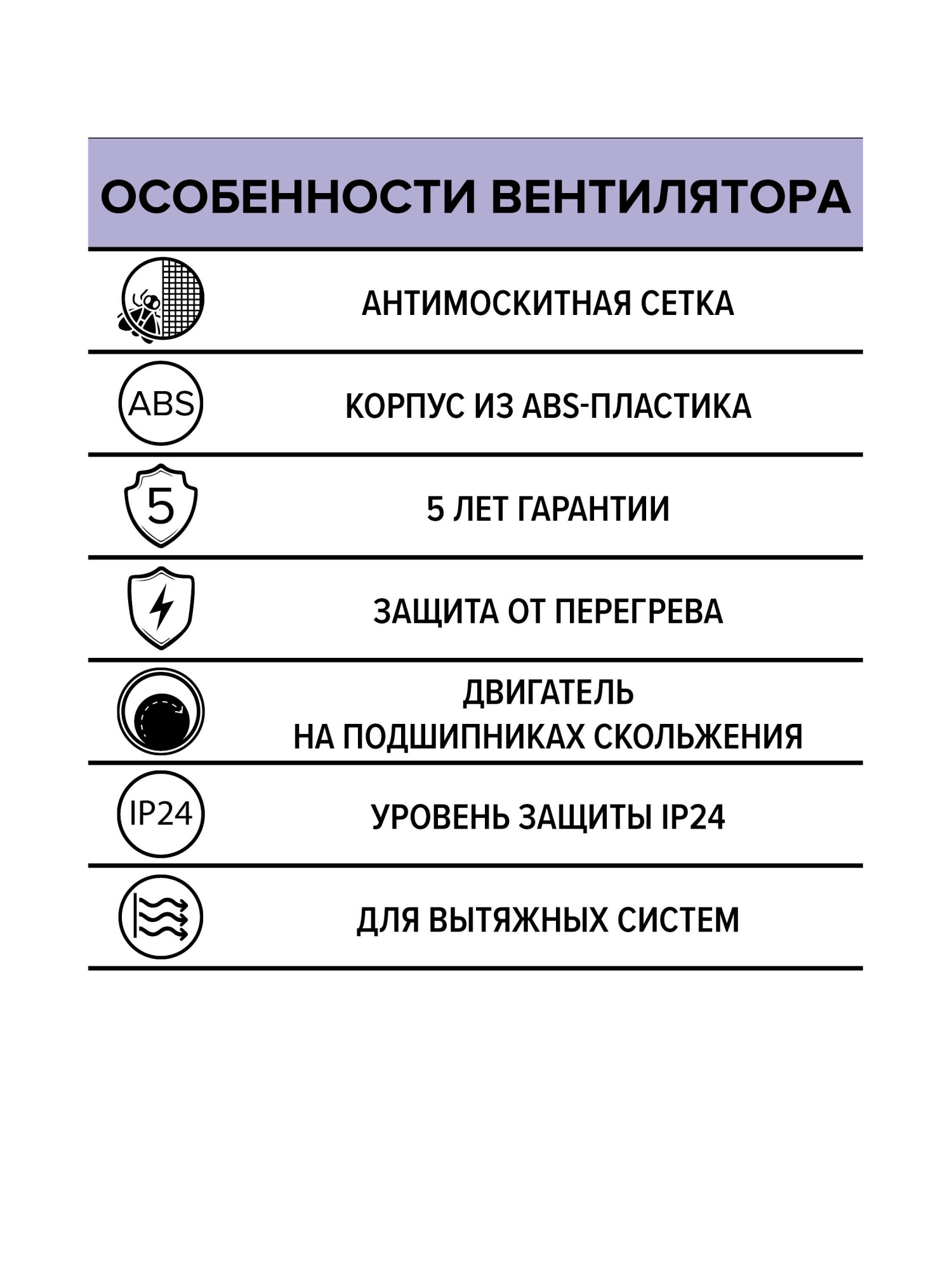 EURO 5S выполнен из высококачественного и прочного ABS-пластика, который надежно прослужит весь срок использования и не изменит цвет. Также во всех моделях EURO S в комплекте идет антимоскитная сетка, которая надежно защищает помещение от проникновения насекомых и грязи из вентиляционного канала.