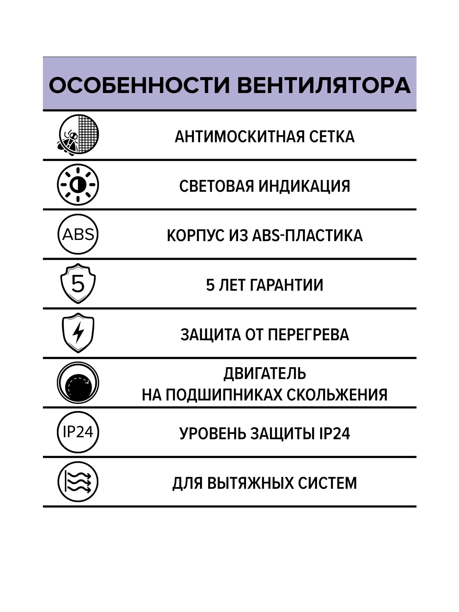 • Подходит для установки в ванной и санузле: стандартный для бытовых вентиляторов уровень пылевлагозащиты — IP24.
