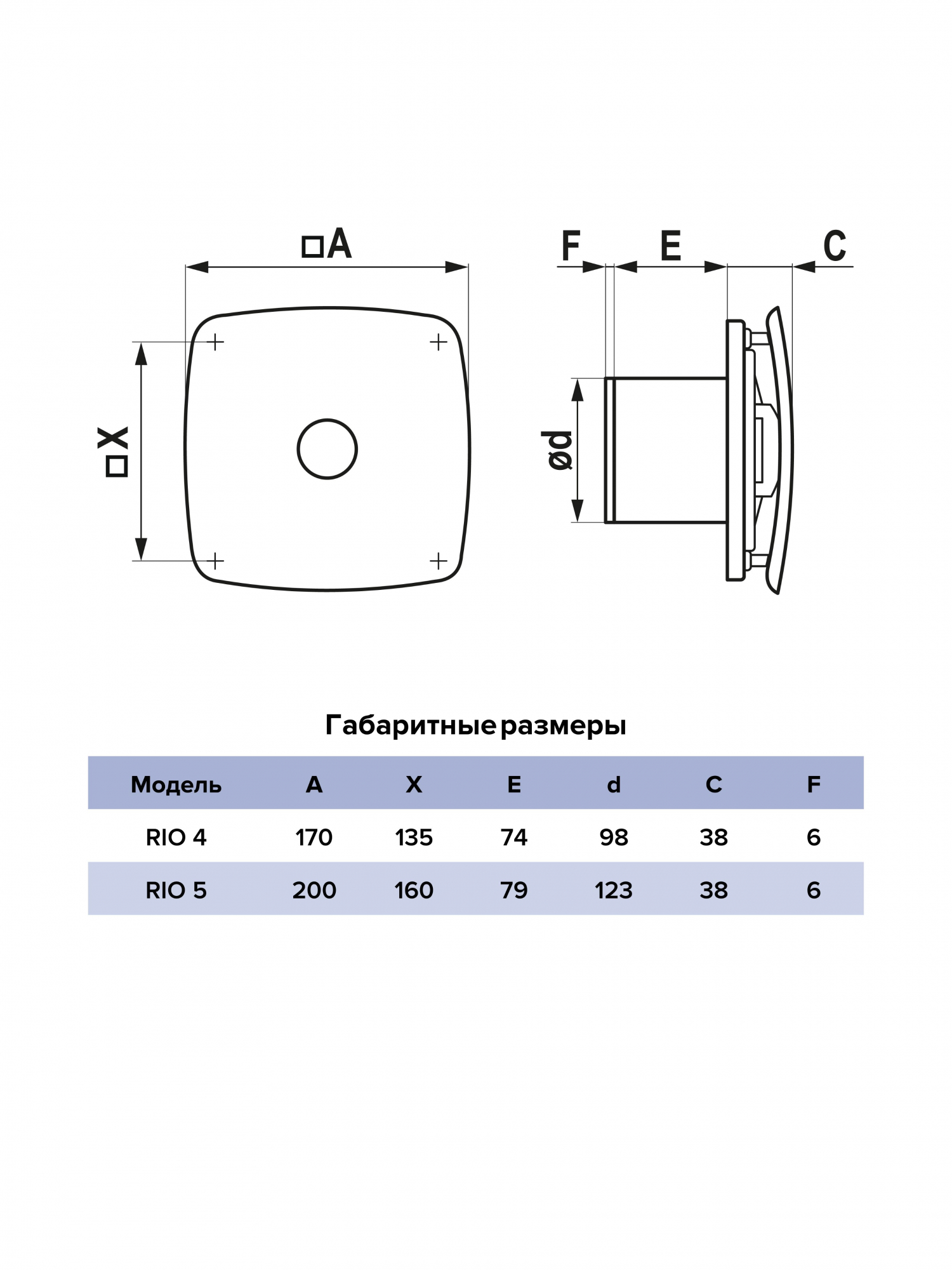 Вентилятор RIO применяется для постоянной или периодической вытяжной вентиляции санузлов, душевых, кухонь и других бытовых помещений. Подходит для монтажа в вентиляционные шахты и соединения с воздуховодами. Особенности вентилятора RIO: - гармоничный дизайн закрытой лицевой панели с плавными скругленными формами и центральным декоративным отверстием. Панель легко снимается, упрощая обслуживание вентилятора; - бесшумный обратный клапан с силиконовыми стопперами, - монтажный шаблон в комплекте для простой и удобной установки вентилятора, - широкий выбор цветовых решений и текстур: базовый белый (RIO 4C, RIO 4C-02, RIO 4C MRH), Ivory (RIO 4C Ivory), Matt black (RIO 4C Matt black), Matt white (RIO 4C Matt white), Dark Gray metal (RIO 4C Dark gray metal), Gray metal (RIO 4C Gray metal), Champagne (RIO 4C Champagne). Долговечный двигатель на шарикоподшипниках гарантирует до 40 000 часов непрерывной работы, предохранитель Termo fuse отключит вентилятор при нагреве обмотки свыше +130 °C. RIO можно установить как в стену, так и в потолок (при снятии обратного клапана), двигатель не требует дополнительного обслуживания. Корпус и панель выполнены из высококачественного и прочного ABS-пластика, который надежно прослужит весь срок использования и не пожелтеет. Монтаж осуществляется с помощью саморезов, которые входят в комплект. Уровень защиты – IP24. Гарантийный срок 5 лет.