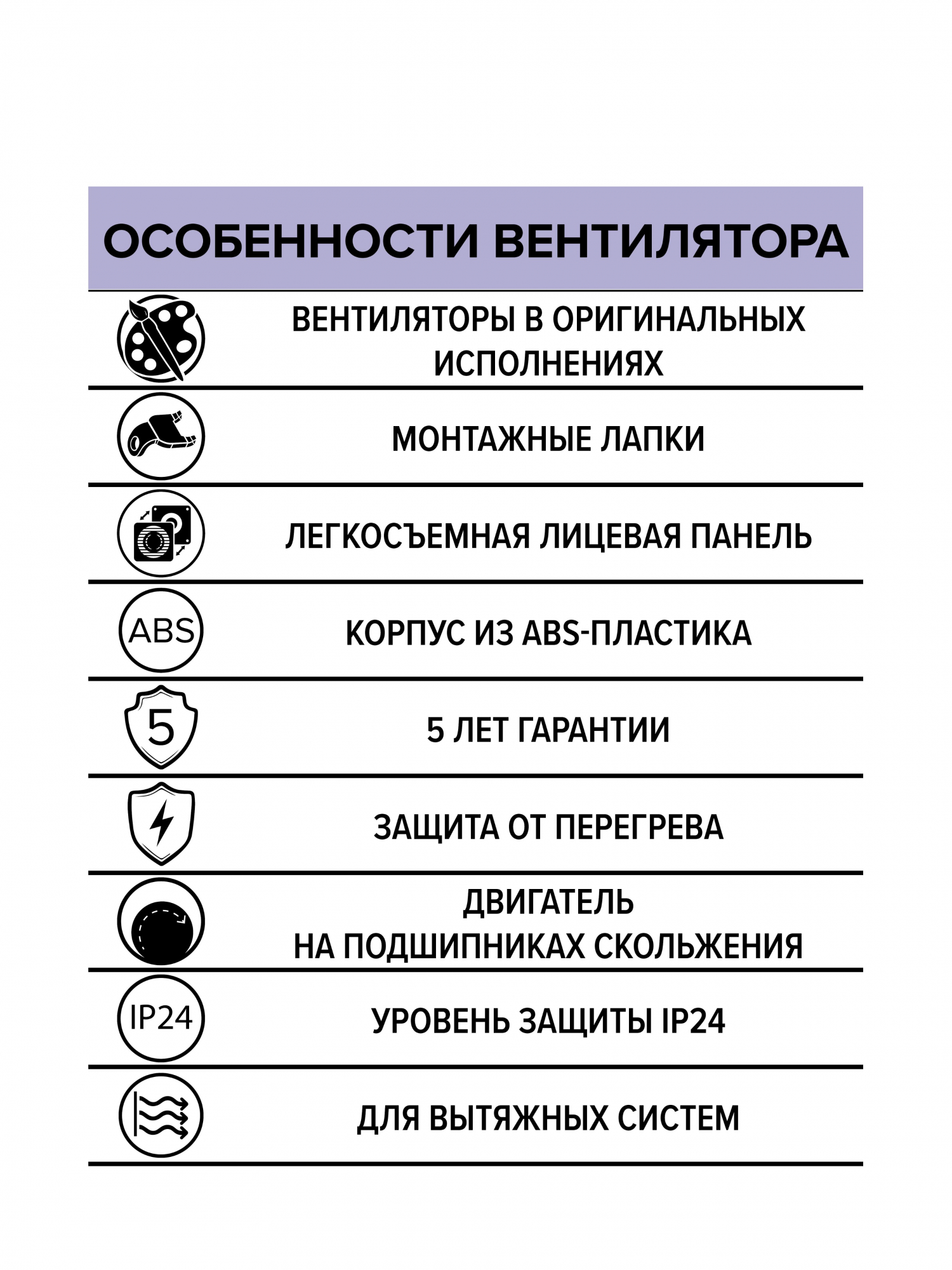 Благодаря высокой производительности (100 м³/ч) вентилятор эффективно удаляет из помещения влажный загрязненный воздух и неприятные запахи.